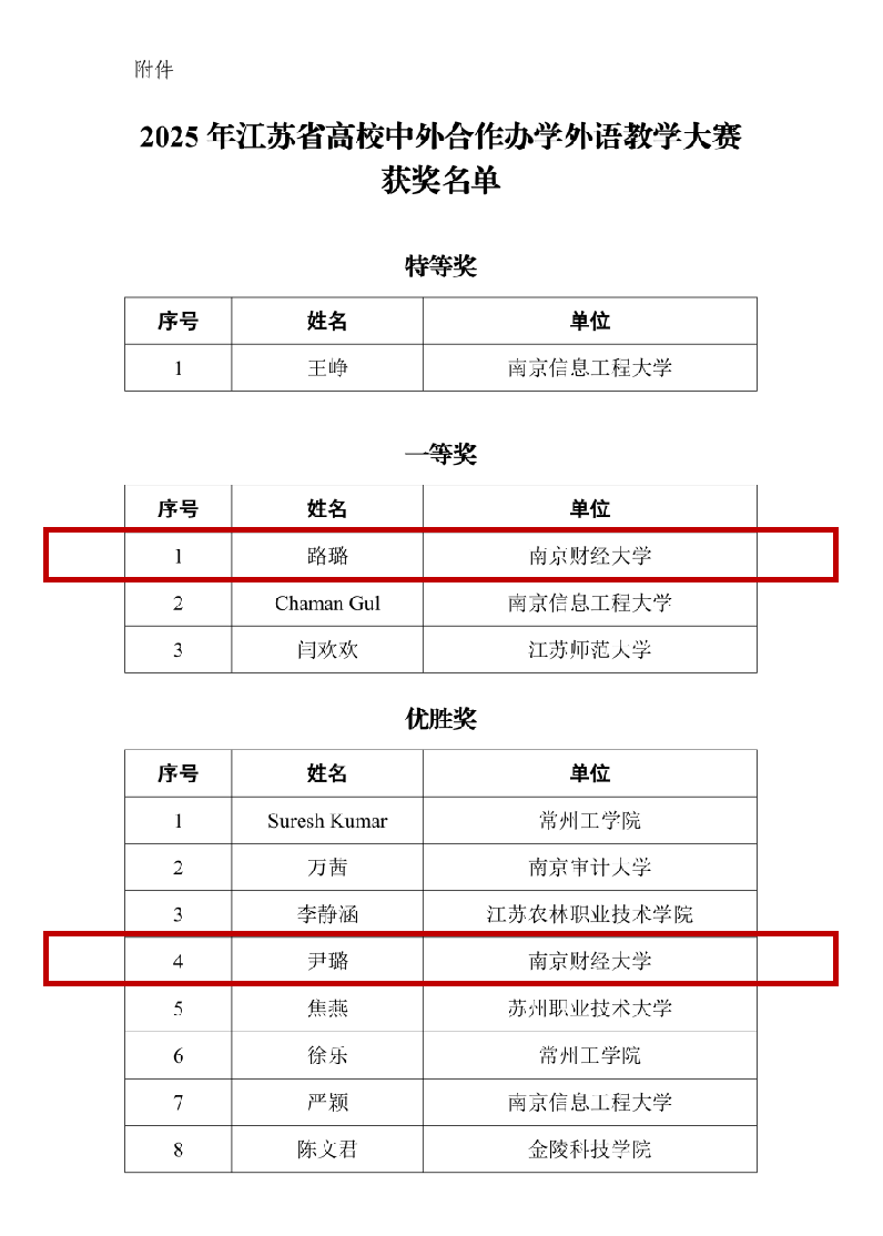 11月21日,由江苏省教育厅、江苏省高等教育学会指导,江苏省高等教育学会涉外办学研究委员会主办的江苏省高校中外合作办学外语教学大赛决赛圆满落幕。我校梅西学院选送的新方课程中方主讲教师路璐(金融学院)、尹璐(公共管理学院)凭借扎实的教学功底、国际化的教学理念与精湛的外语授课能力脱颖而出,分别荣获一等奖与优胜奖。